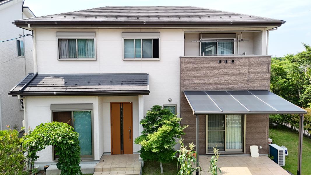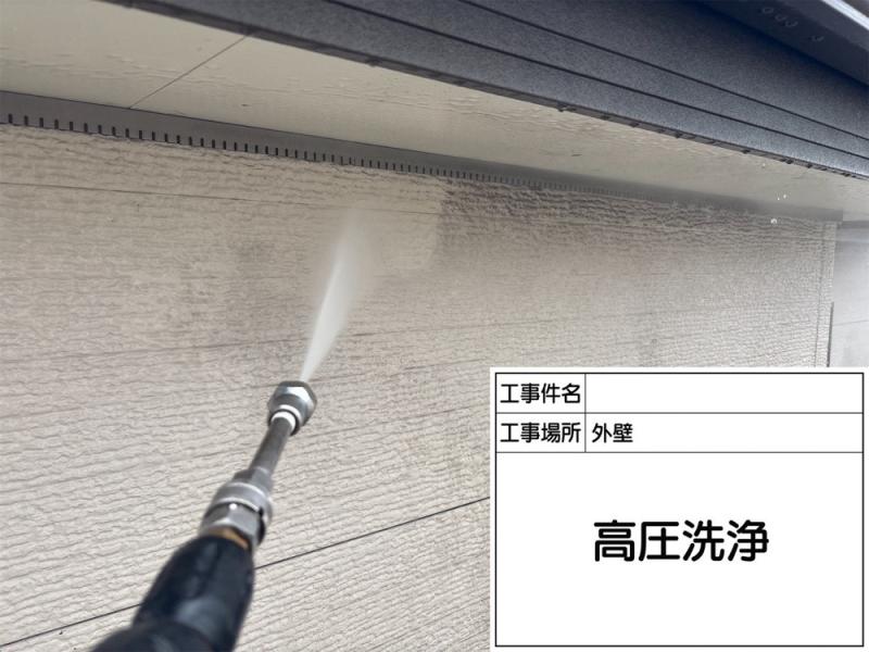 外壁塗装前に高圧洗浄を行い、汚れやコケ、旧塗膜を除去しています。下地処理を丁寧に行うことで、塗膜の密着性と耐久性を高めています。